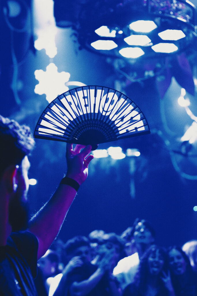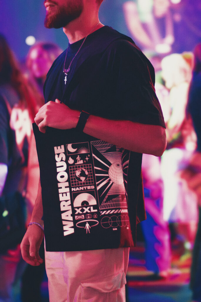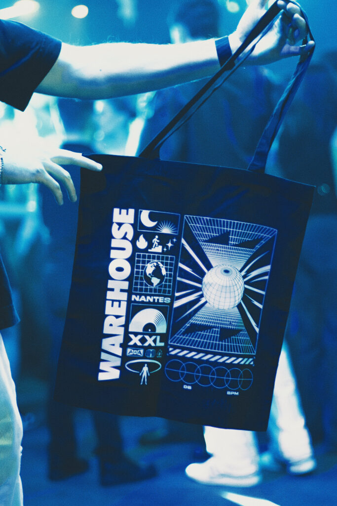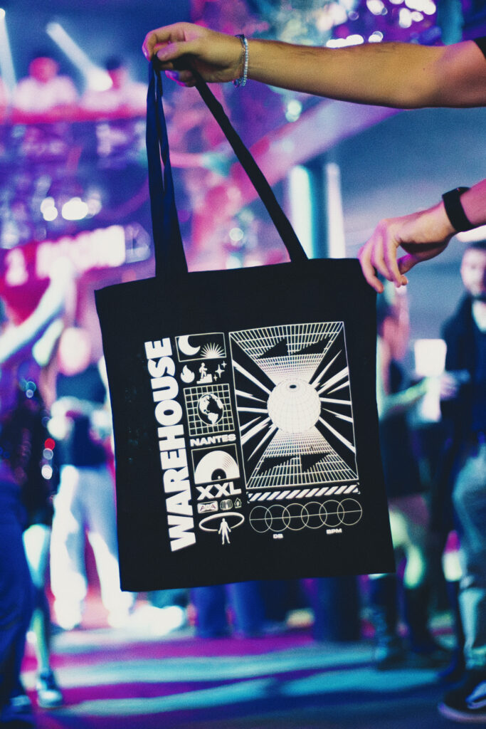 Dernière collaboration: Le Warehouse à Nantes, avec la production de tote bags, porte-clés et éventails, pensés pour être distribués, utilisés et conservés.